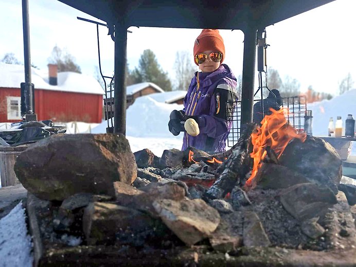 På vintern, när snön kommit, drar vi upp några korta längdskidspår, bygger backar för pulka eller stjärtlapp och tar fram slängkälken och sparkarna.