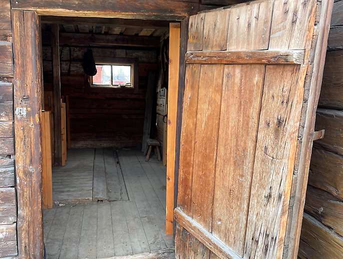 EtiketterStallet på Hägnan är troligen från 1800-talet och har två spiltor och en rymlig foderbod. Det utskjutande taket ska skydda seldonen som hänger på framväggens träkrokar från väder och vind.